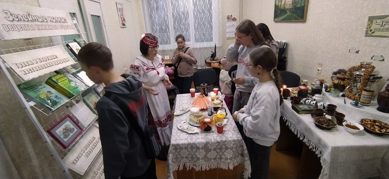 Распахнула свои двери необычная локация – знахарская комната: самотканые скатерти, пучки лекарственных растений, глиняная посуда и книжная экспозиция «Зелейные полки: рецепты книжного счастья». Это пространство, где литература встречается с народной традицией, а каждая книга превращается в целебное снадобье для души. Гостей встречал приглушённый свет свечей, запах сухих трав и шелест старинных страниц.