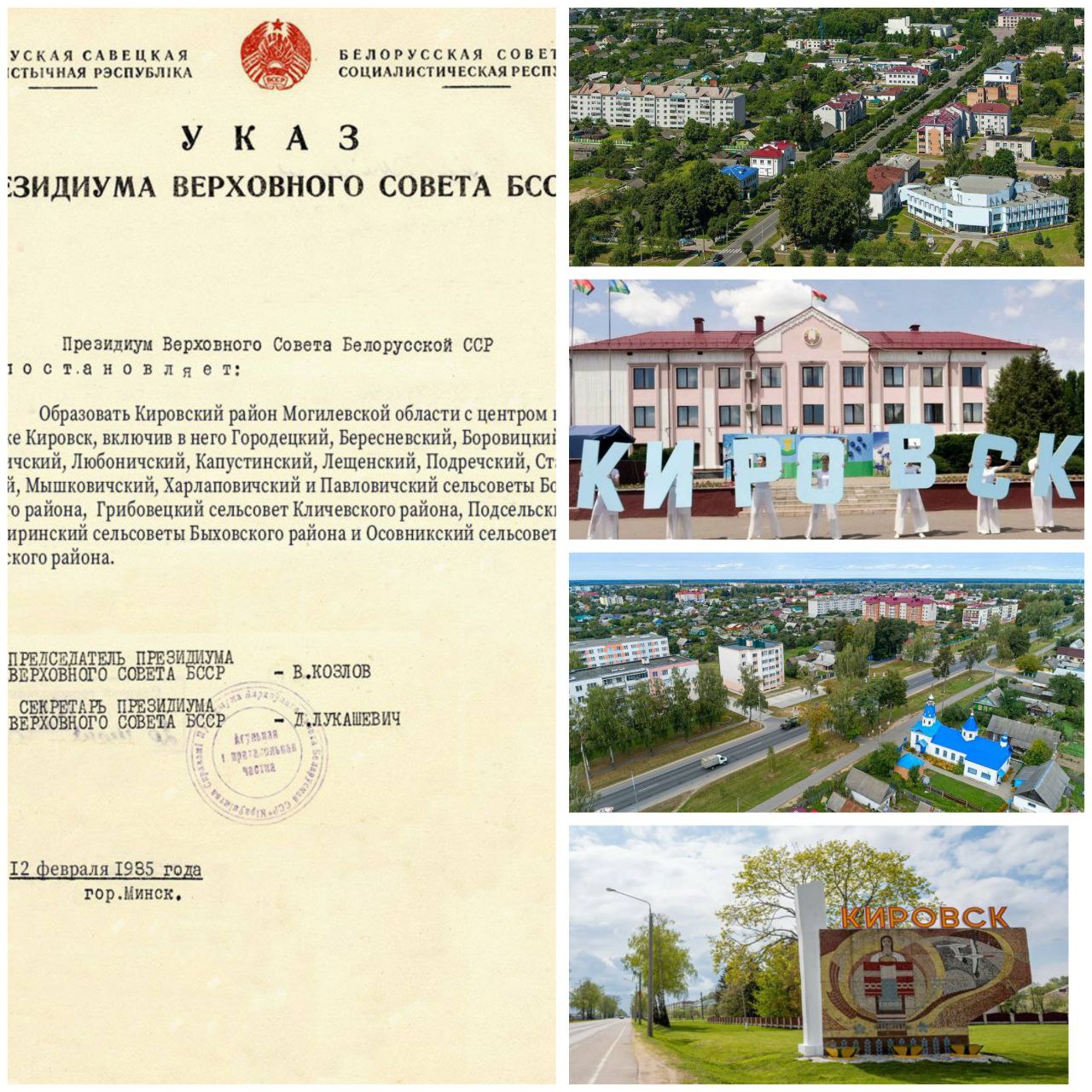 Згодна УКАЗА 00Прэзідыума Вярхоўнага Савета БССР ад 12 лютага 1935 года пачаўся працоўны і гераічны летапіс нашага Кіраўска і Кіраўскага раёна, у які ўпісаны многія старонкі: перыяд калектывізацыі, гады нямецка-фашысцкай акупацыі, час аднаўлення разбуранай народнай гаспадаркі пасля Вялікай Айчыннай вайны, дынамічнага развіцця ў наступныя гады.