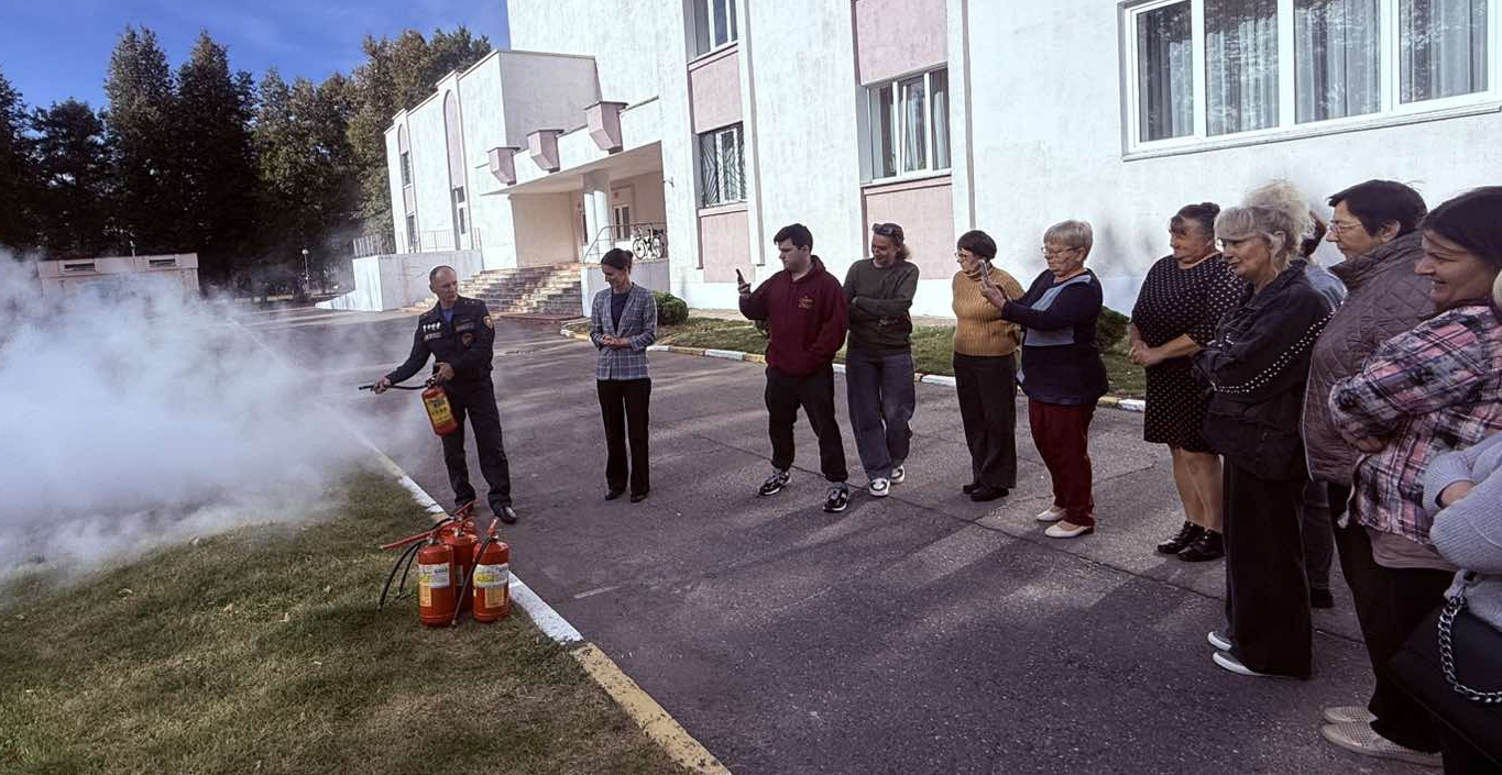 Александр Фёдорович провёл практическое занятие по использованию огнетушителей. Рассказал о мерах предосторожности при использовании первичных средств пожаротушения, о типах огнетушителей, их различиях, правилах использования и приведения в рабочее состояние.
