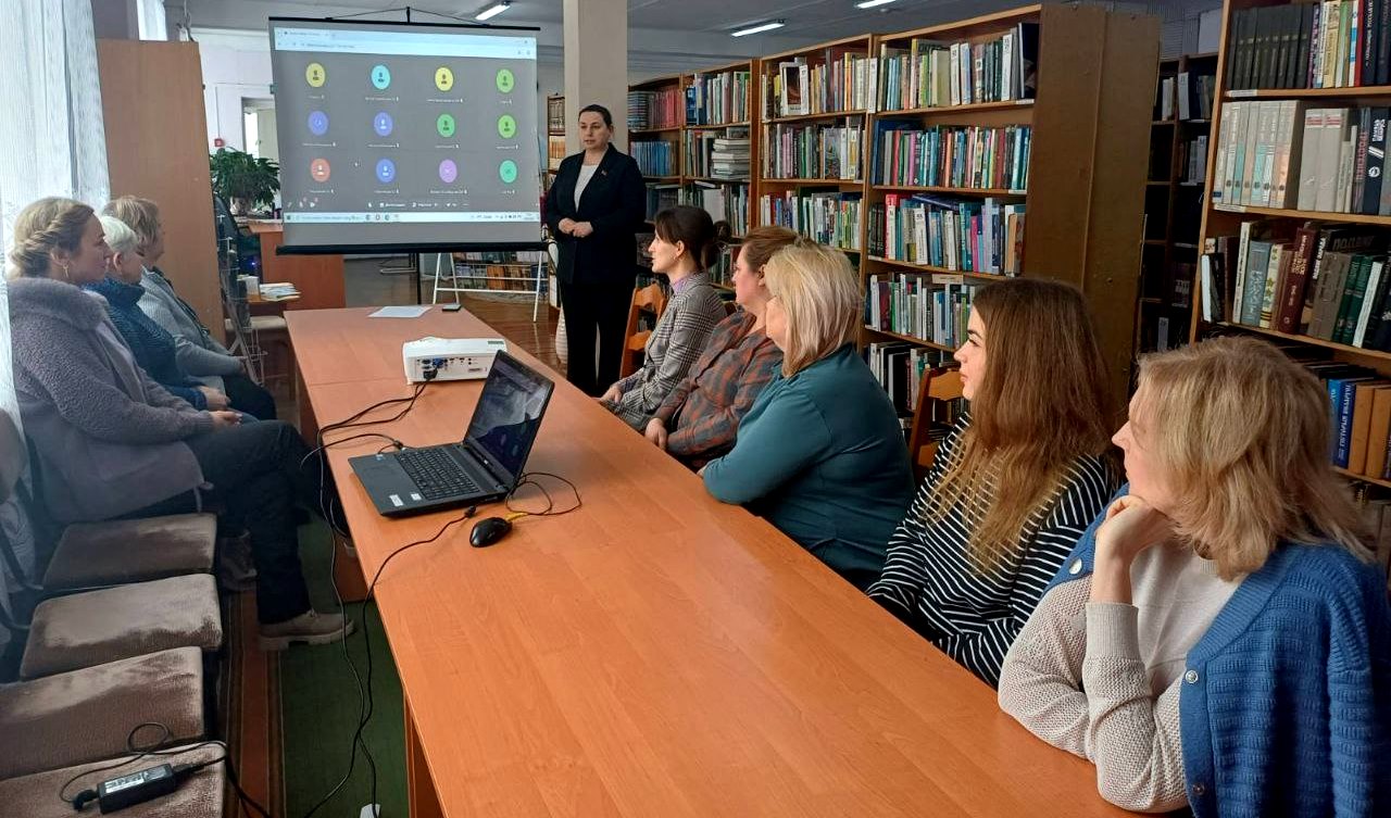 Перед трудовым коллективом ГУК «Сеть библиотек Кировского района» выступила председатель Кировской районной организационной структуры РГОО «Белорусское общество «Знание» Марина Цветкова.